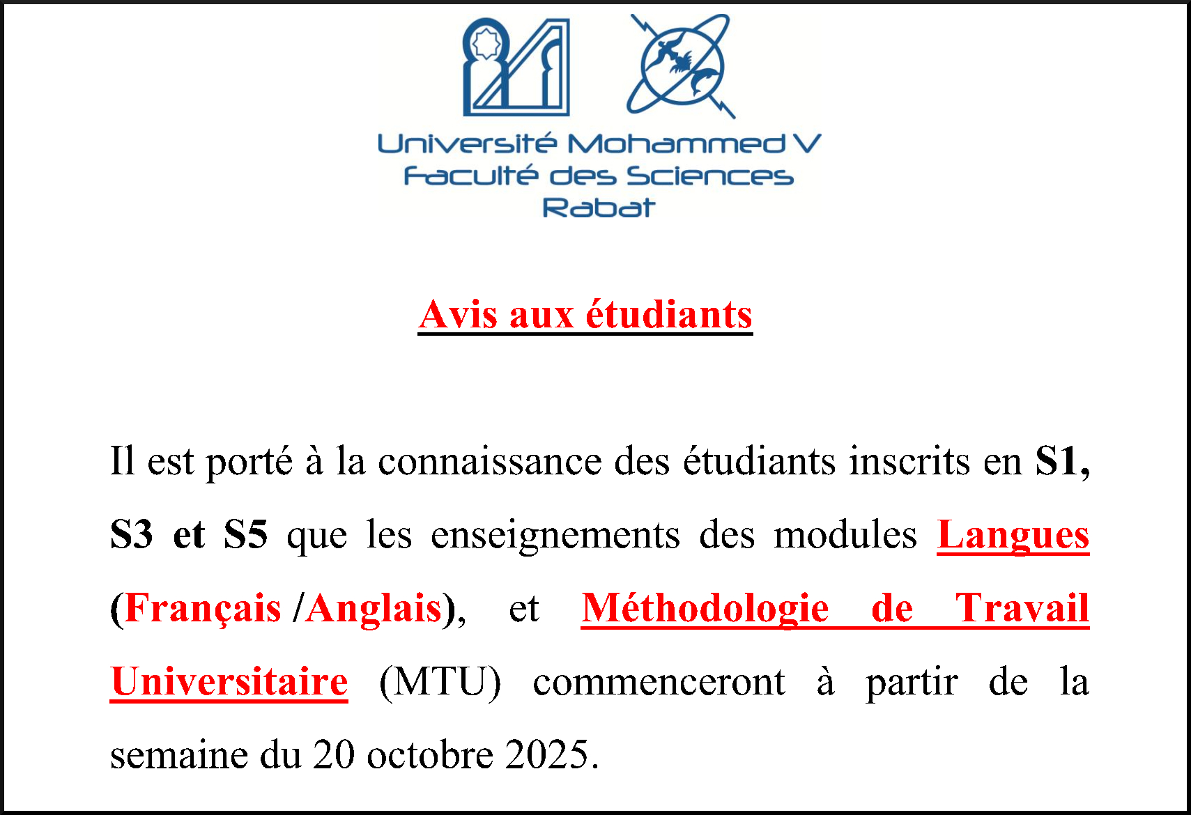 Il est porté à la connaissance des étudiants inscrits en S1, S3 et S5 que les enseignements des modules.....