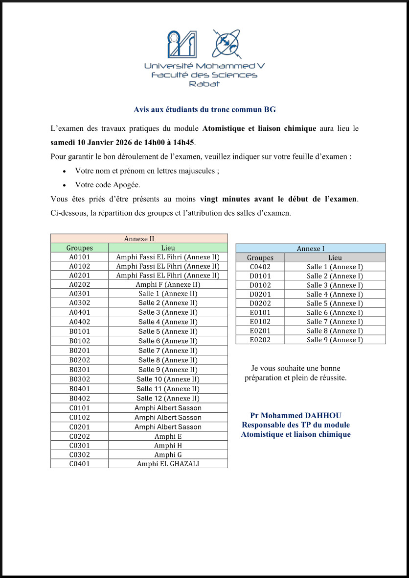 L’examen des travaux pratiques du module Atomistique et liaison chimique aura lieu le samedi 10 Janvier 2026 de 14h00 à 14h45.