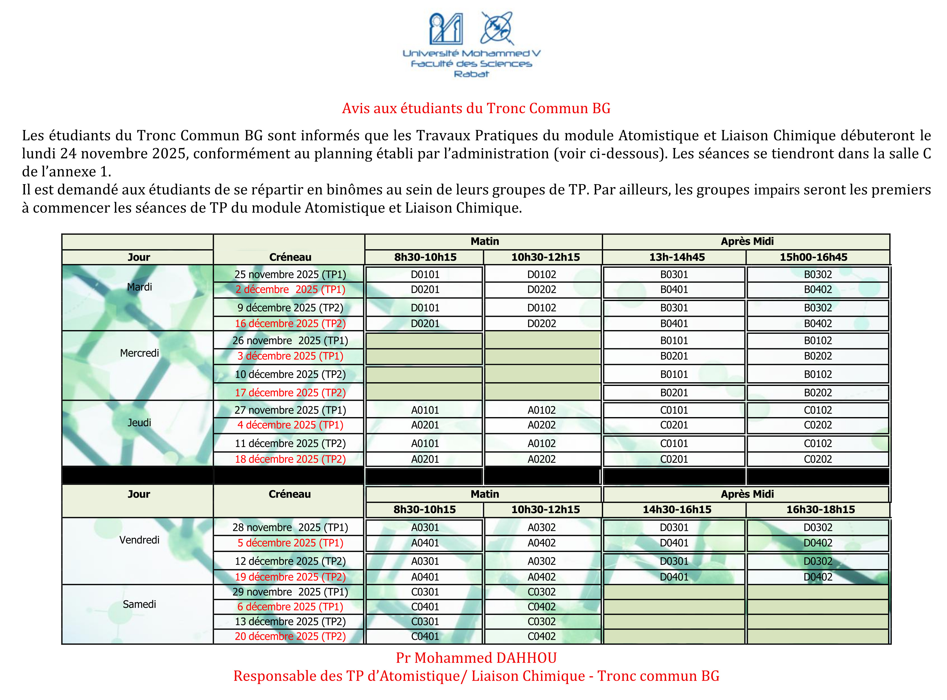 Les étudiants du Tronc Commun BG sont informés que les Travaux Pratiques du module Atomistique et Liaison Chimique débuteront le lundi 24 novembre 2025, conformément au planning établi par l’administration...