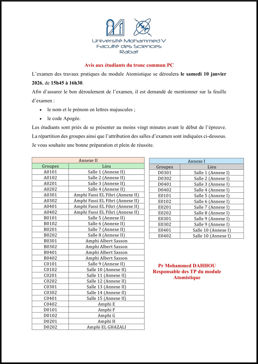 L’examen des travaux pratiques du module Atomistique se déroulera le samedi 10 janvier 2026, de 15h45 à 16h30.