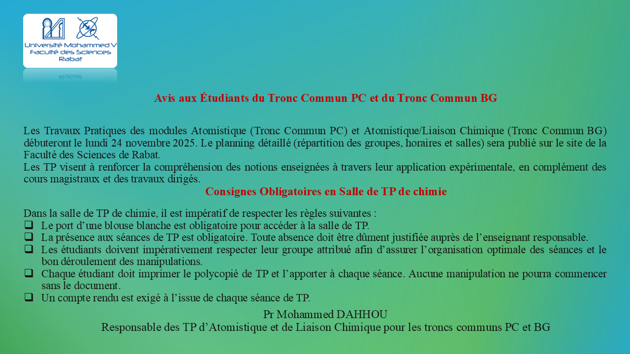 Les Travaux Pratiques des modules Atomistique (Tronc Commun PC) et Atomistique/Liaison Chimique (Tronc Commun BG) débuteront le lundi 24 novembre 2025....