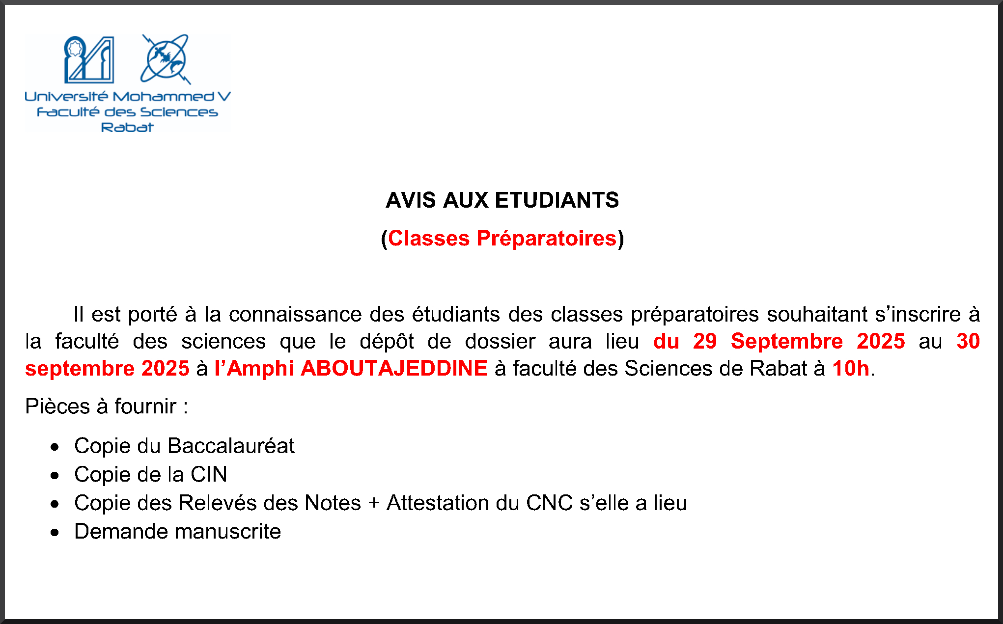 Il est porté à la connaissance des étudiants des classes préparatoires souhaitant s’inscrire à la faculté des scienxces que le dépôt de dossier aura lieu du 29 Septembre 2025 au 30 septembre....