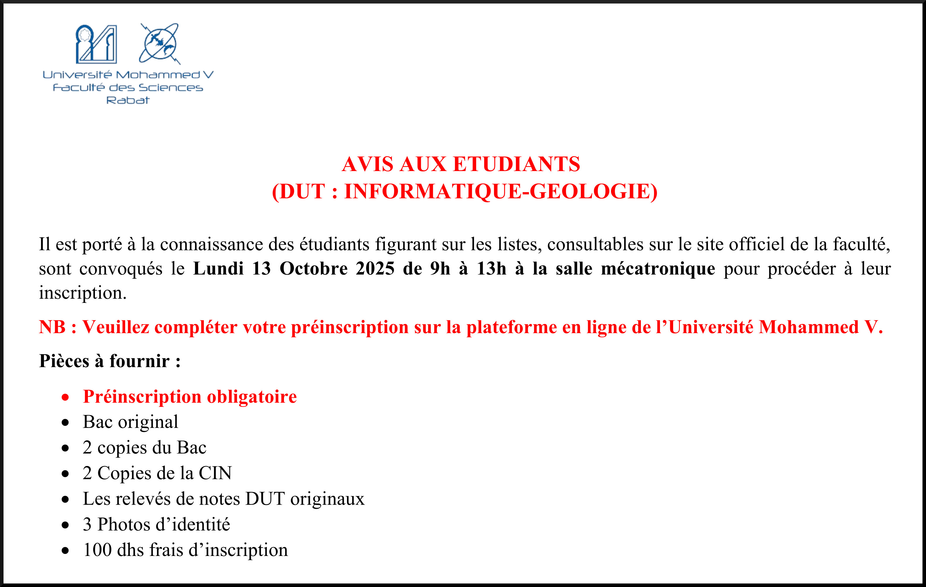 Il est porté à la connaissance des étudiants figurant sur les listes, consultables sur le site officiel de la faculté, sont convoqués le Lundi 13 Octobre 2025 de 9h à 13h à la salle mécatronique....