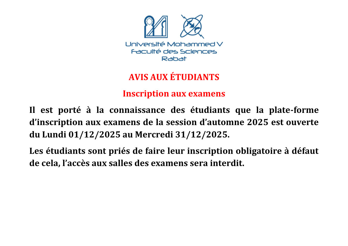 Il est porté à la connaissance des étudiants que la plate-forme d’inscription aux examens de la session d’automne 2025 est ouverte du Lundi 01/12/2025 au Mercredi 31/12/2025.....